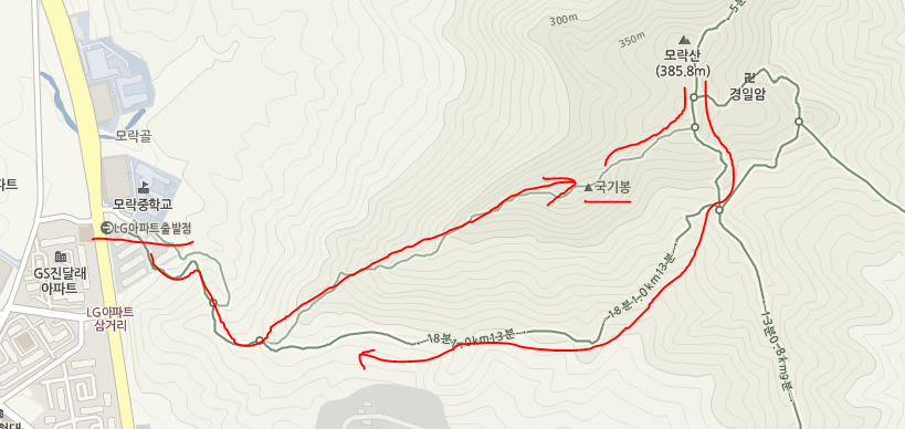 아래 경로를 통해 LG아파트 출발 >> 국기봉 >> 모락산 정상 >> 아래 경로로 하산 하는 경로로 돌아 보았습니다.