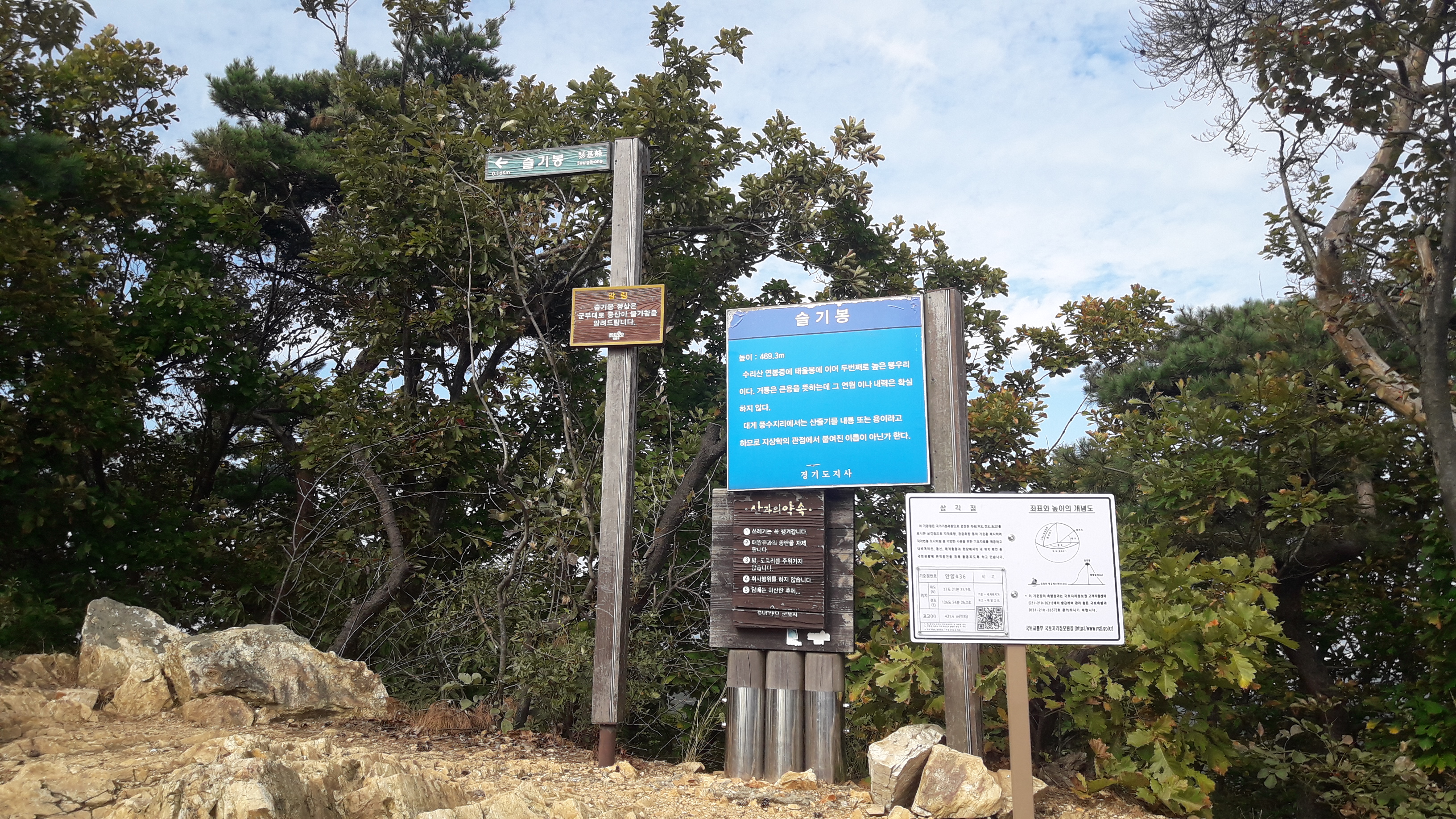 아래 사진에서와 같이 이정표에서 한마음 등산로를 향해서 전진하다보면 슬기봉 1020m 라고 설명이 나옵니다. 계속 가보면 산길이 끝나고 아래 사진처럼 계단이 나오고요. 그러고 나면 이정표가 나오는데 마치 여기가 슬기봉 끝인것 처럼 설명 합