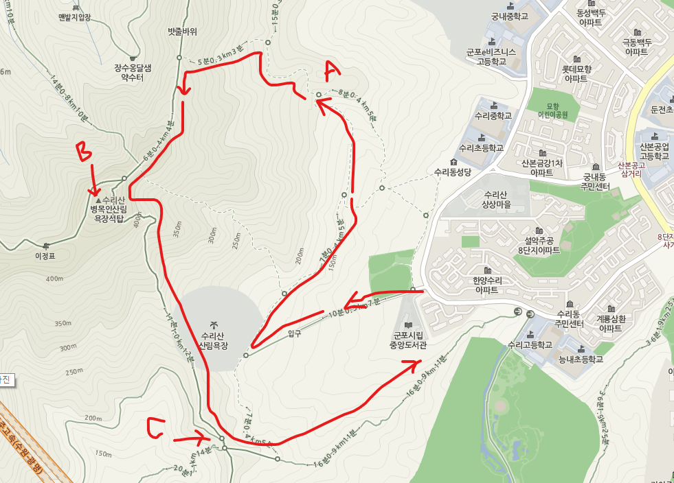 아래 그림의 경로로 등산을 하였는데, 군포시립 중앙도서관 등산로를 출발하여 A 지점은 상연사(절) 이고, 슬기봉 (469m) 를 거쳐서 C지점을 임도오거리 라고 하는데 정자도 많고, 사람이 많이 다니는 길로 완만하여 산책에 좋은 코스 입니다.
