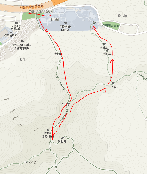 모락산 등산로는 여러 군데 있지만 이번에는 갈미 문학공원 에서 출발하는 코스를 다녀왔습니다. 아래 지도의 붉은색 부분이 등산 코스 였습니다. 내려올때는 계원예술대학교 옆 주차장과 연결된 곳으로 내려 왔네요.