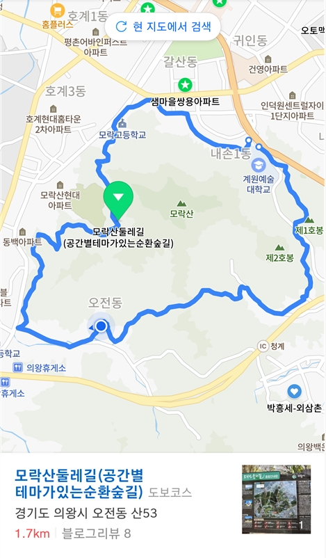 길을 찾기 어려워 네이버지도를 켜고 "모락산둘레길"을 검색하면 위의 그림과 같이 길이 표시되고 파란색 점으로 표시되는 현재위치를 통해서 둘레길을 돌아 볼 수 있다.